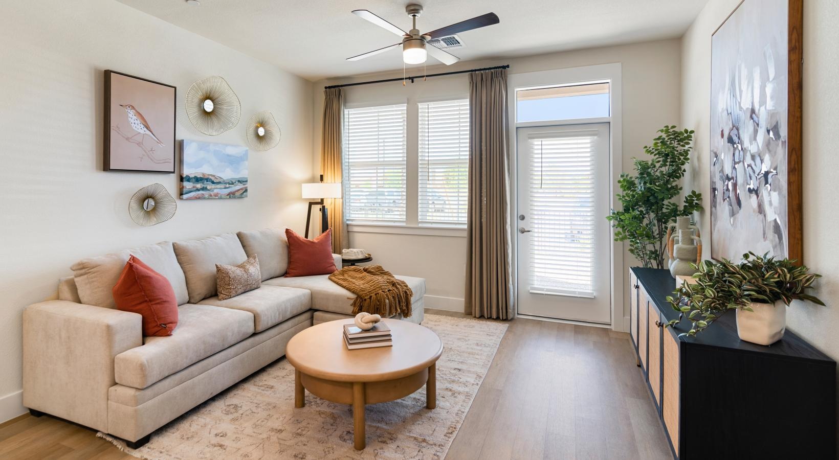 • a living room with a couch and a table