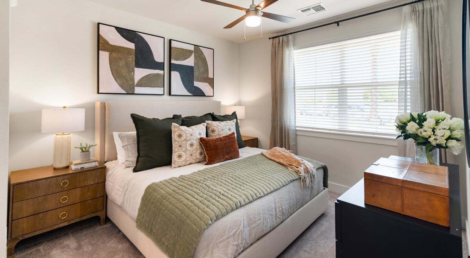 • a bedroom with a fan and a bed